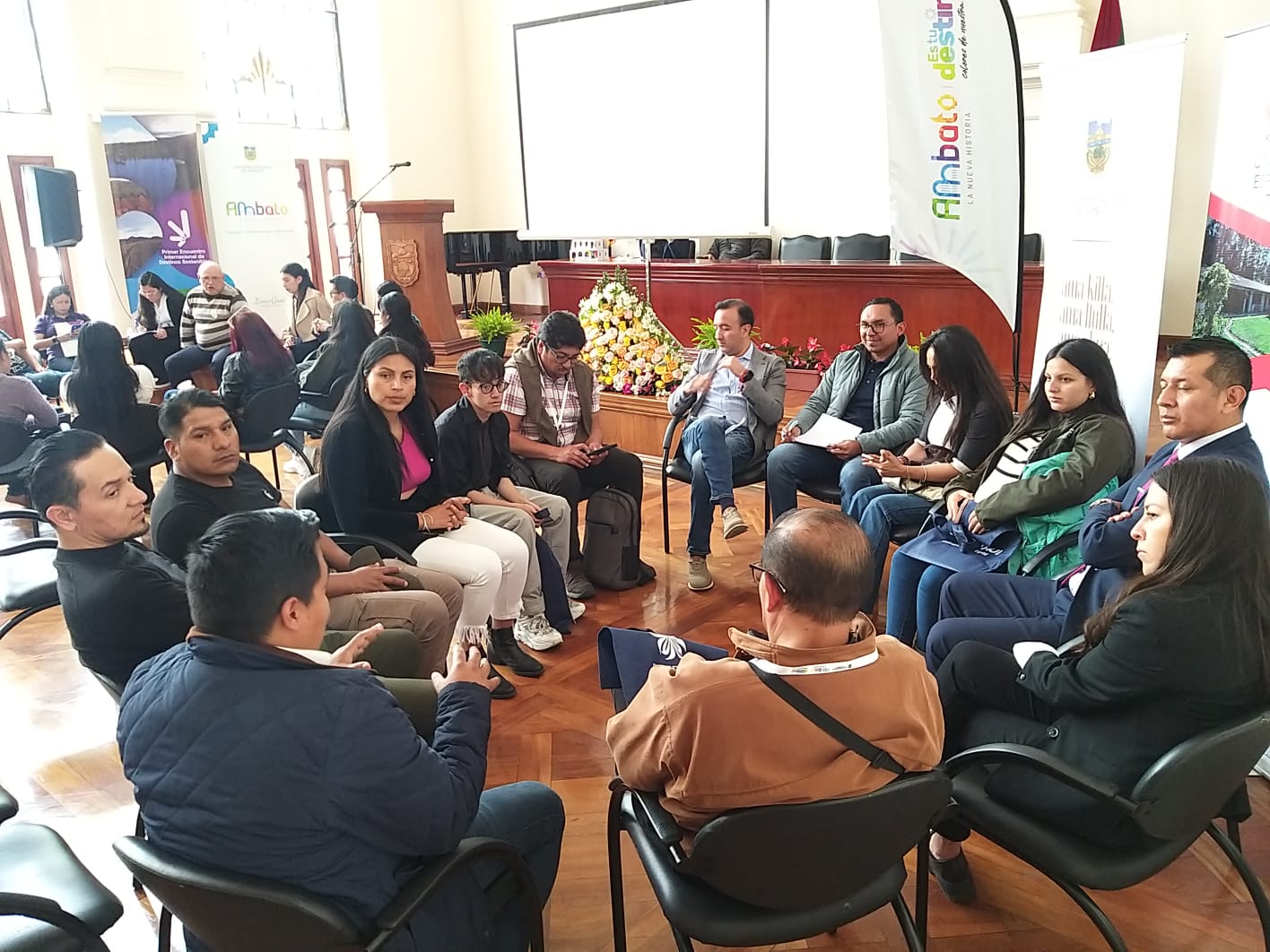 Estudiantes, docentes, operadores y técnicos en turismo de instituciones públicas fueron parte del Primer Encuentro Internacional de Destino Sostenible que se desarrolló en el Salón de la Ciudad del Municipio de Ambato el 9 y 10 de octubre de 2024. Los expositores que compartieron sus experiencias fueron de Ecuador, Estados Unidos y Costa Rica.